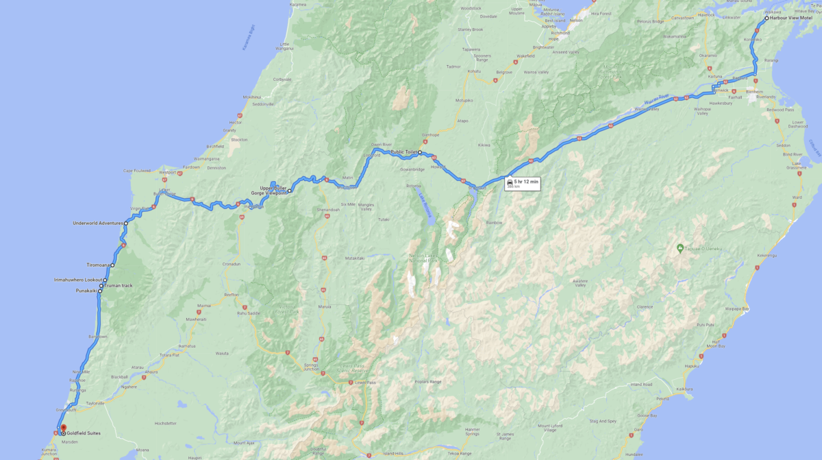 Greymouth下面其实还有个景点,Hokitika Gorge。犹豫着要不要去。但是看看前方黑云盖顶,峡谷那么阴估计没什么看头。而且看看地图峡谷距离Greymouth还有50多分钟单程,来回俩小时了。就决定今天暂且放弃,明天看看情况。直奔今天的小旅店Goldfield Suite。