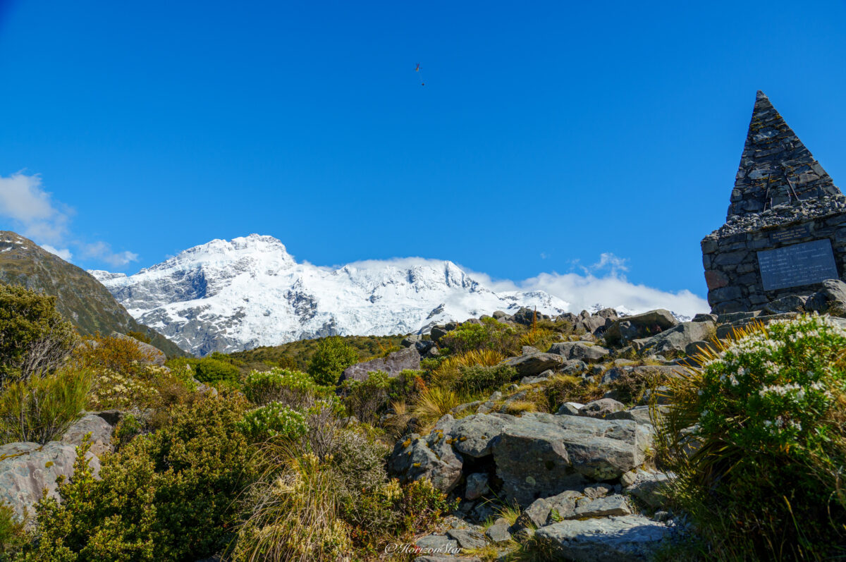 往回走一半的路程,从小路就爬到了Alpine Memorial纪念碑脚下。这个碑是为所有在登顶Mt Cook而逝去的人建立的。