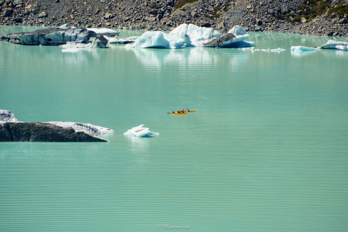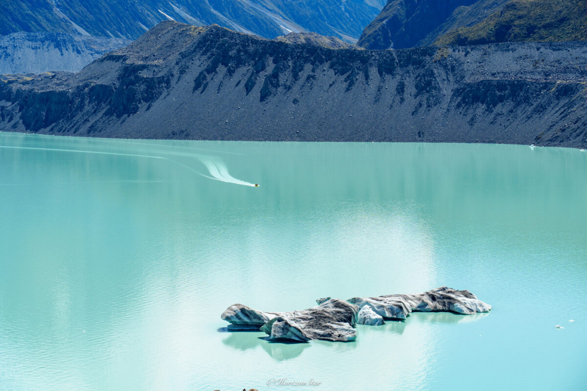 顿时被Tasman Lake震撼到了。远处脏脏的就是Tasman冰川了。想了半天,只有一个词可以形容:明珠蒙尘😅