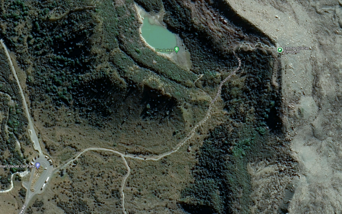 名字虽然是蓝湖,但是颜色其实是绿的。因为当年Tasman冰川在附近的时候,这个湖是冰川水,就是蓝色的。现在冰川已经大撤退到很远了,冰川融水过不来了。现在的水都是雨水积攒起来的,生了水藻,就成了绿色。