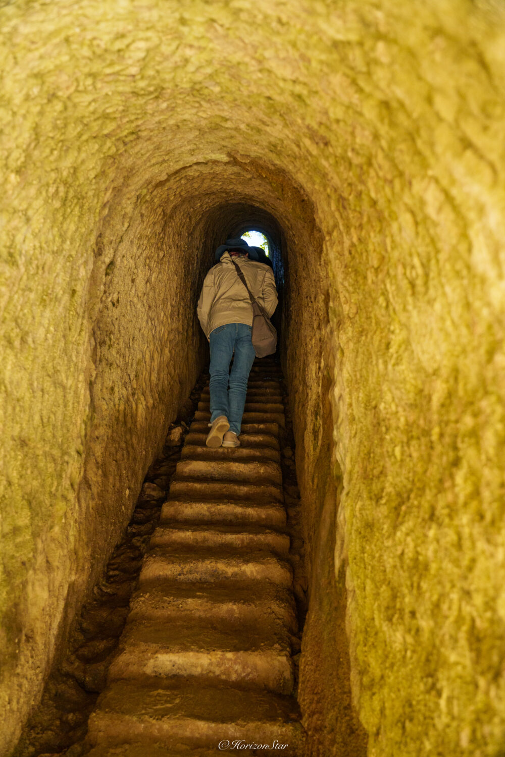 隧道的楼梯往下走。一出隧道,迎面一阵大风带着沙子,所有人都转头躲避。刚走两步又来大风。几阵风沙过后,发现自己浑身上下全沾满了细沙。