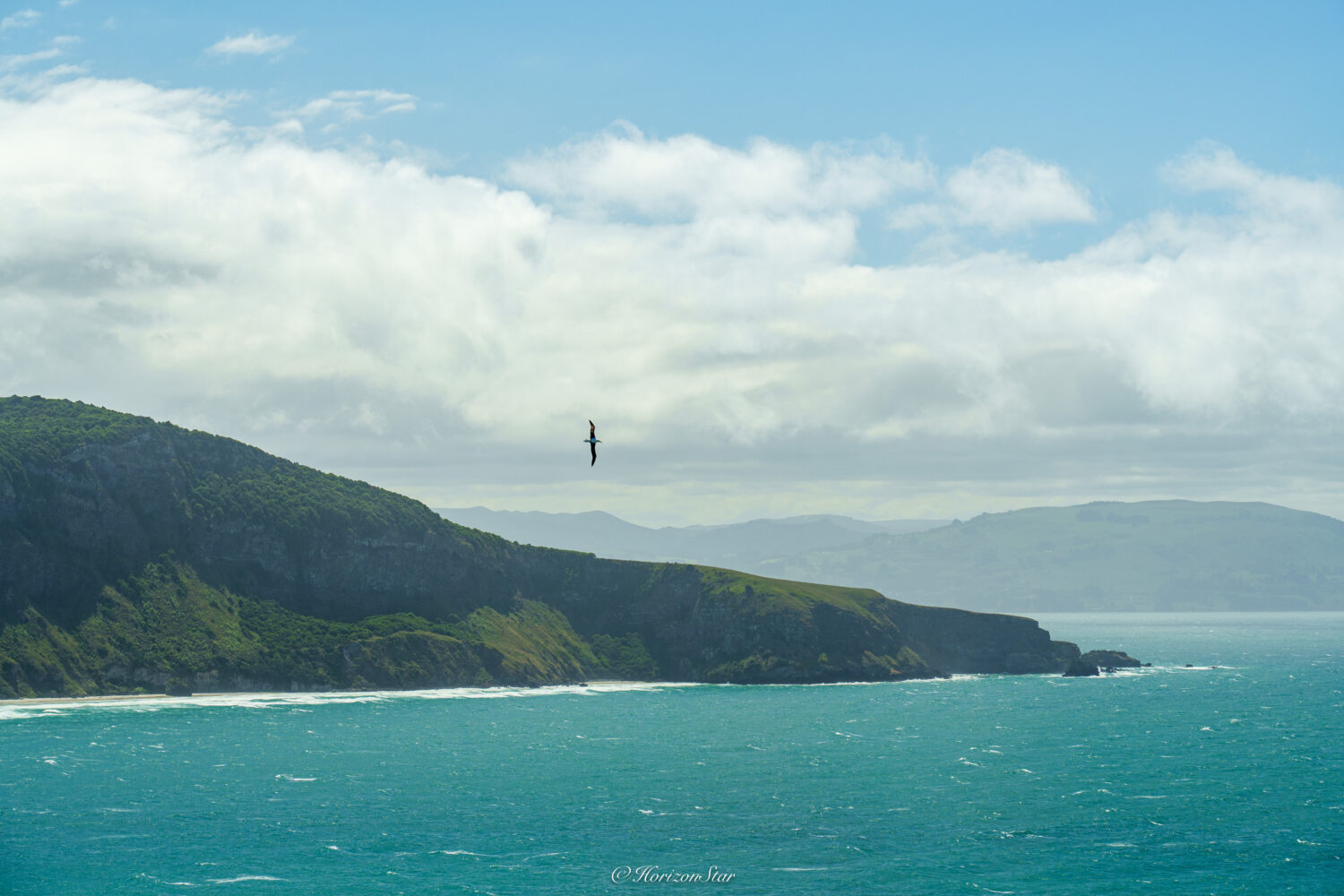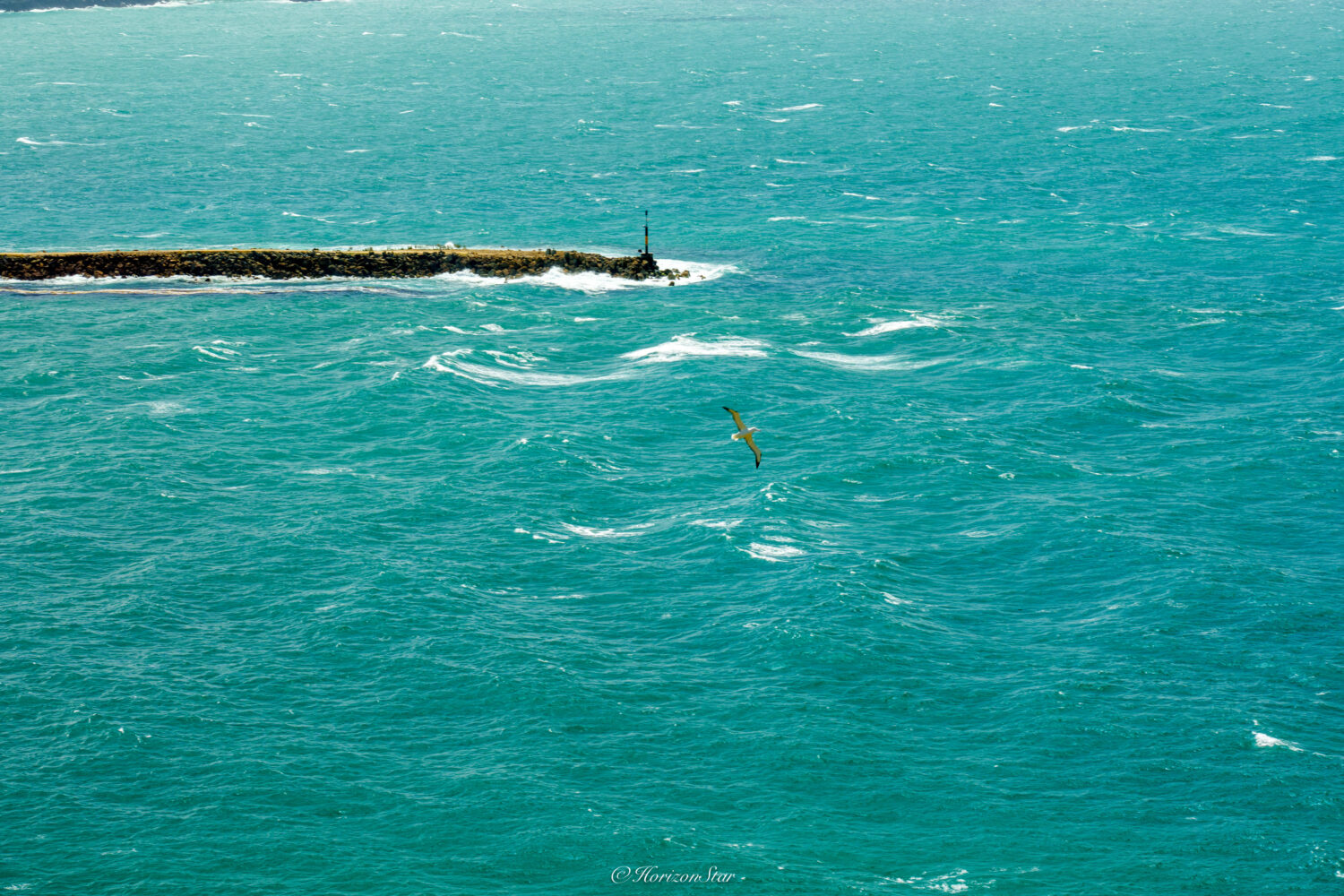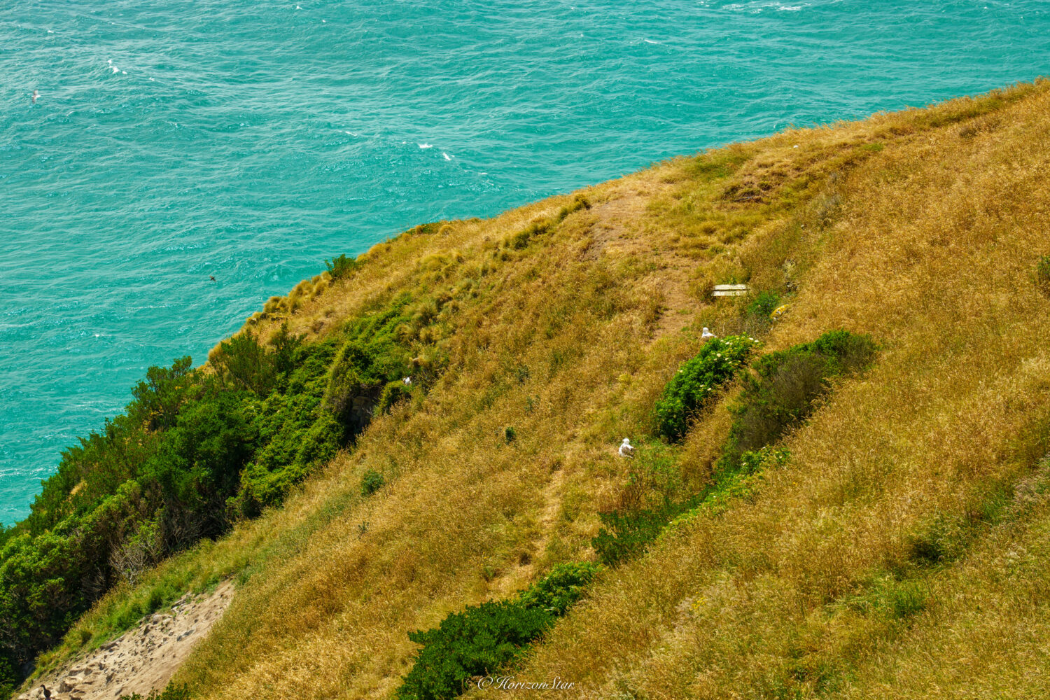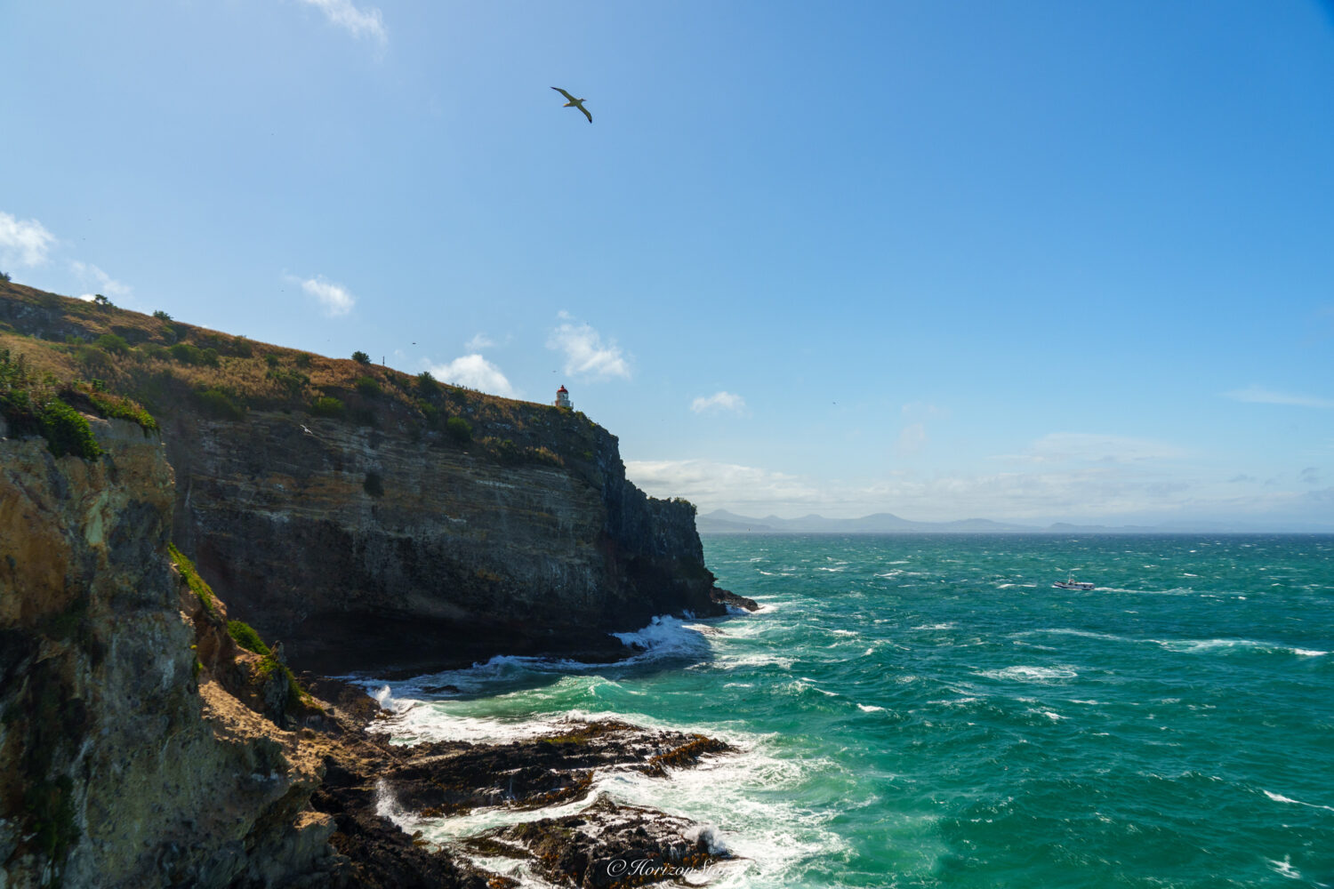 风特别大,感觉都要把人吹下悬崖。那条船还在浪里颠簸。船上的游客为了看几只信天翁也是拼了。汹涌的海浪,灯塔在山顶,信天翁乘风翱翔在天空。对这张照片非常满意。
