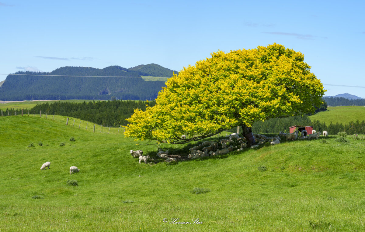 一大群咩咩躲在树荫下,怕太阳晒伤皮肤
