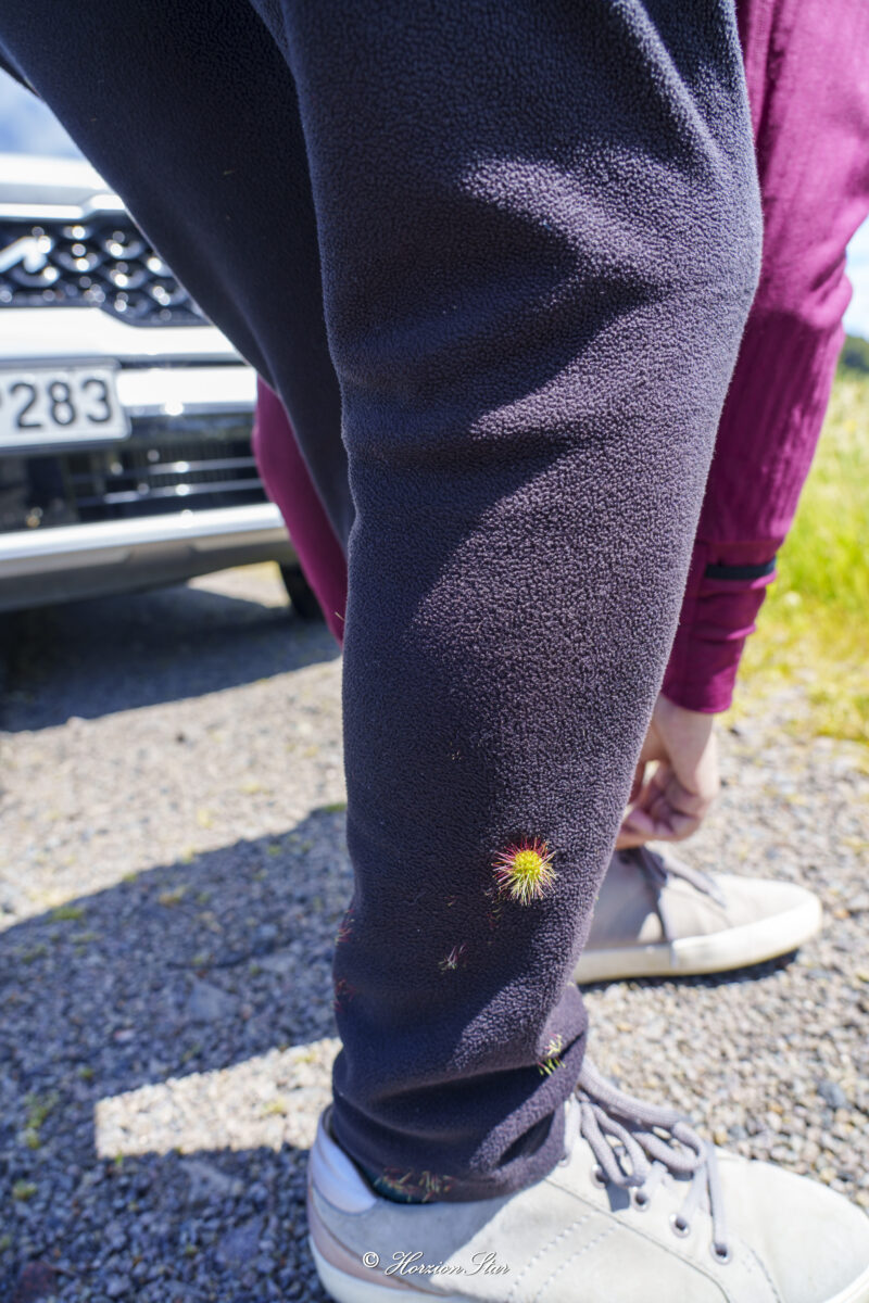 答案揭晓:路边那个人弯腰在拔刺。路边草丛里出来脚腕小腿还有背包上沾满了球,成了个刺猬。好在还是嫩的,不扎人。