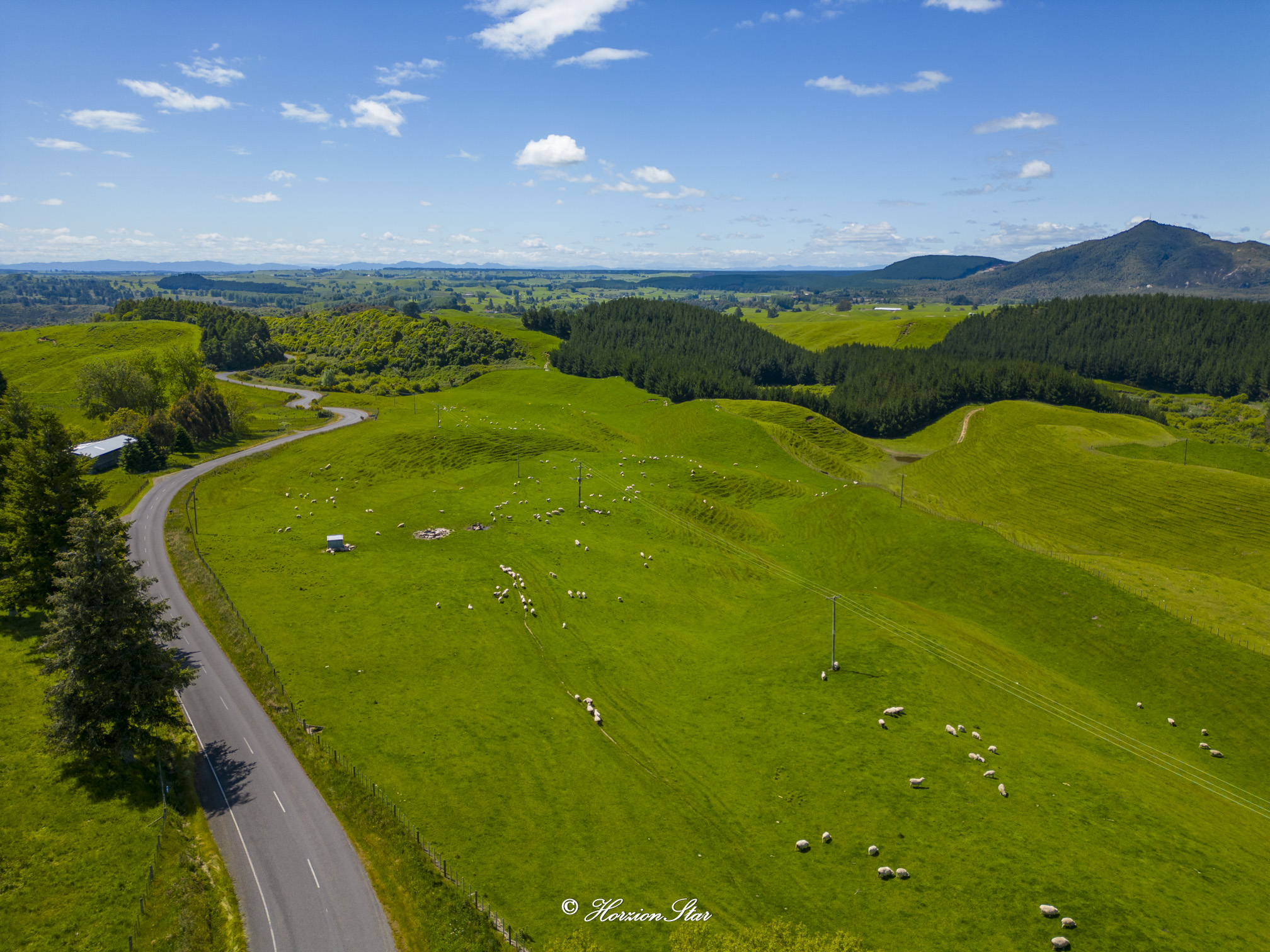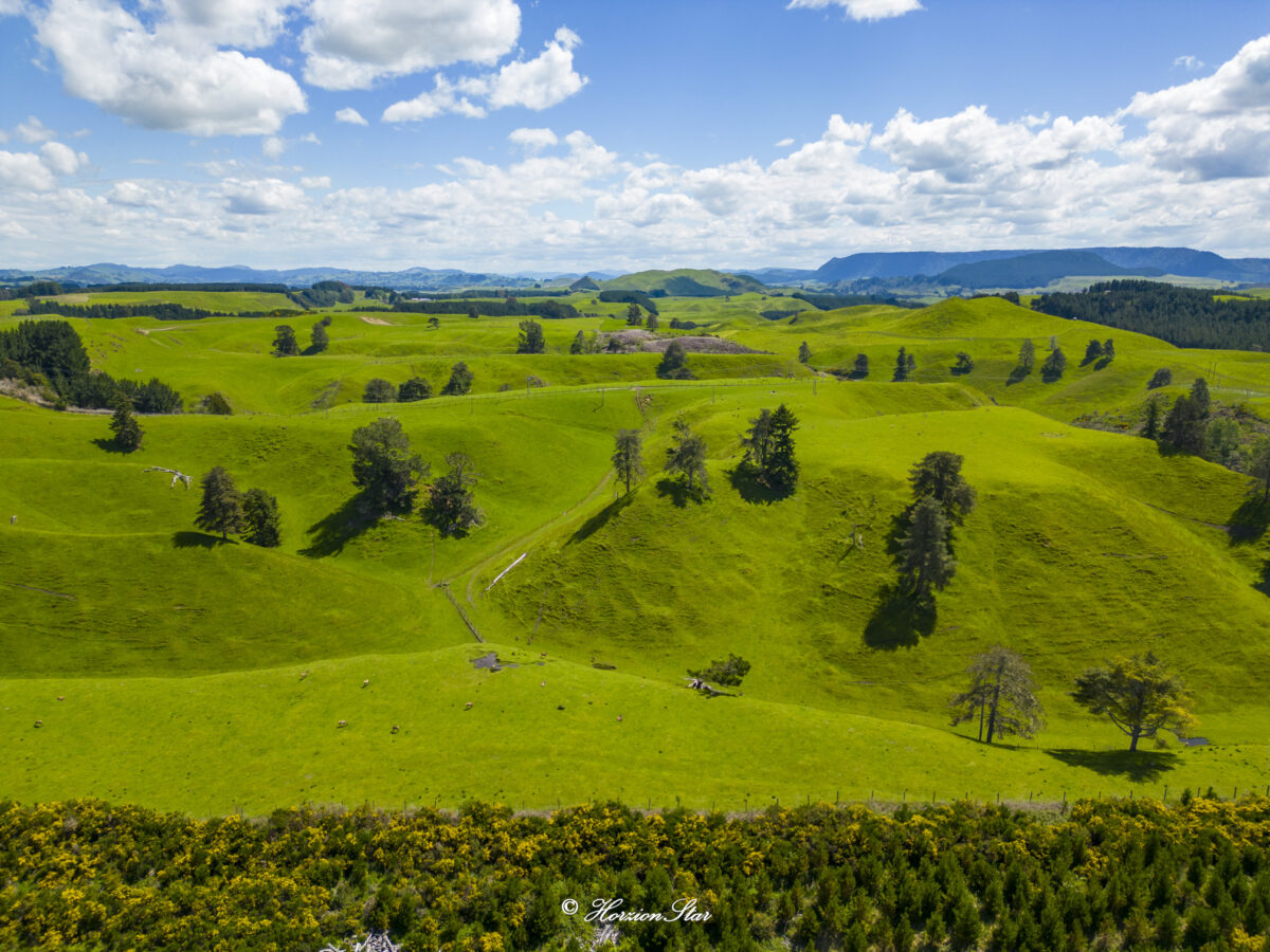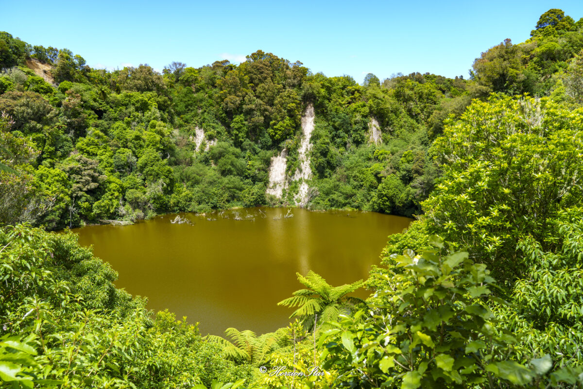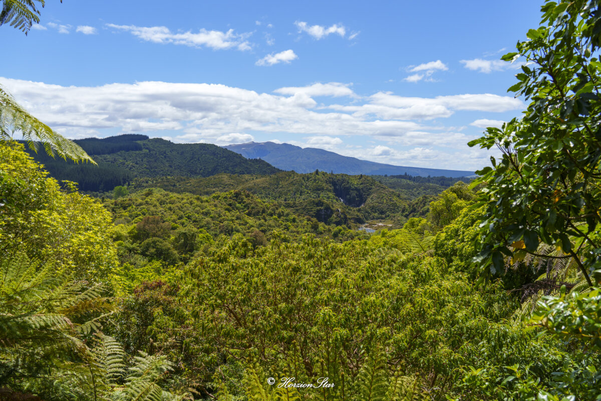 晴朗的天空下郁郁葱葱的树林,掩盖住了100多年前新西兰最大的火山爆发的痕迹。远处山谷,其实就是巨大的火山坑。
