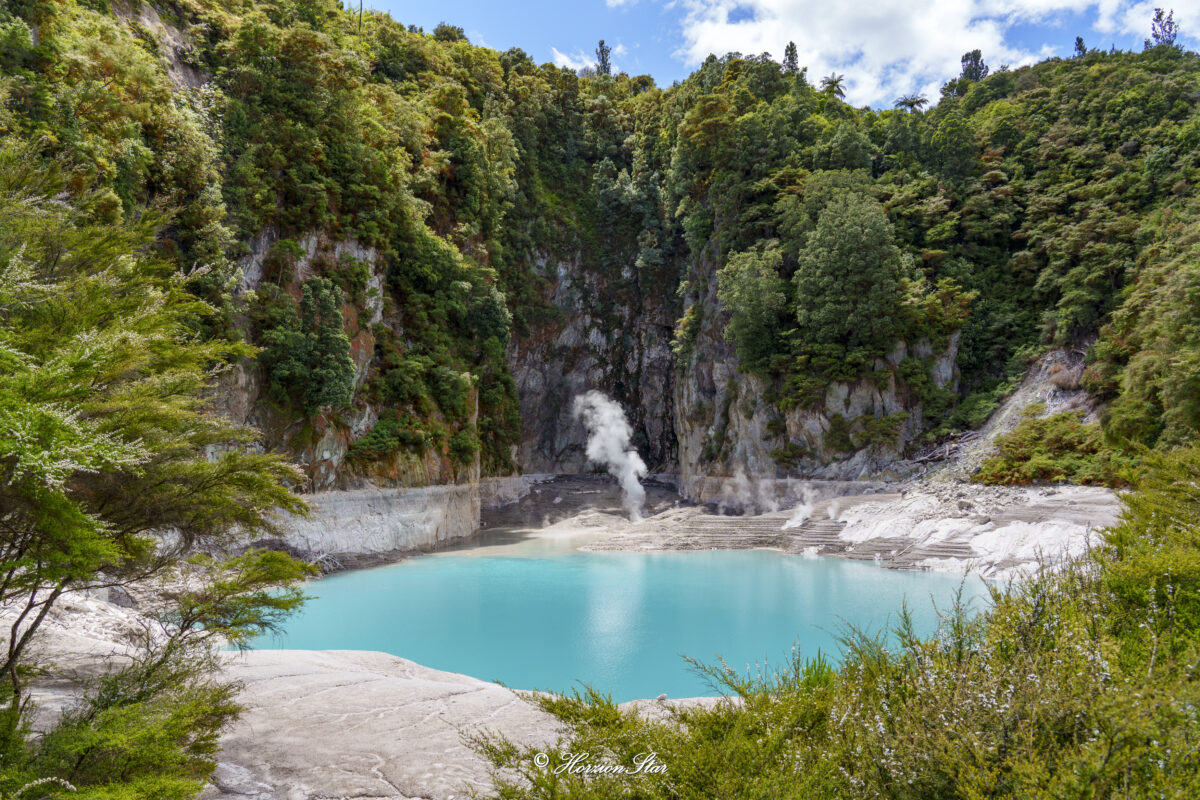 被震撼的无语了。湖很小,甚至还不能走到湖边。但是湖不在大,有仙则灵。晶莹透亮的湖水在阳光下闪耀,被山崖环绕在怀中,它是群山的掌上明珠。还有烟气从地下升起,增添了神秘的氛围