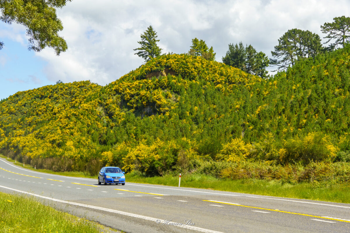 后来上网上搜才知道,原来这是两种花,叫Gorse & Broom,中文翻译就是金雀花 & 扫把花?属于新西兰的入侵物种。欧洲人当初引进来当院墙的。奈何气候太适合,自己又是打不死的小强,结果泛滥的到处都是。据说种子可以躲在地下50年再发芽,比香港的一国两制时间都长。长它的地方本地植物就寸草不生,而且牛羊们也不爱吃。这对畜牧业为主的国家,打击不要太大。因此新西兰每年花大量资金来去除它们。但是看着还是挺好看的哈。