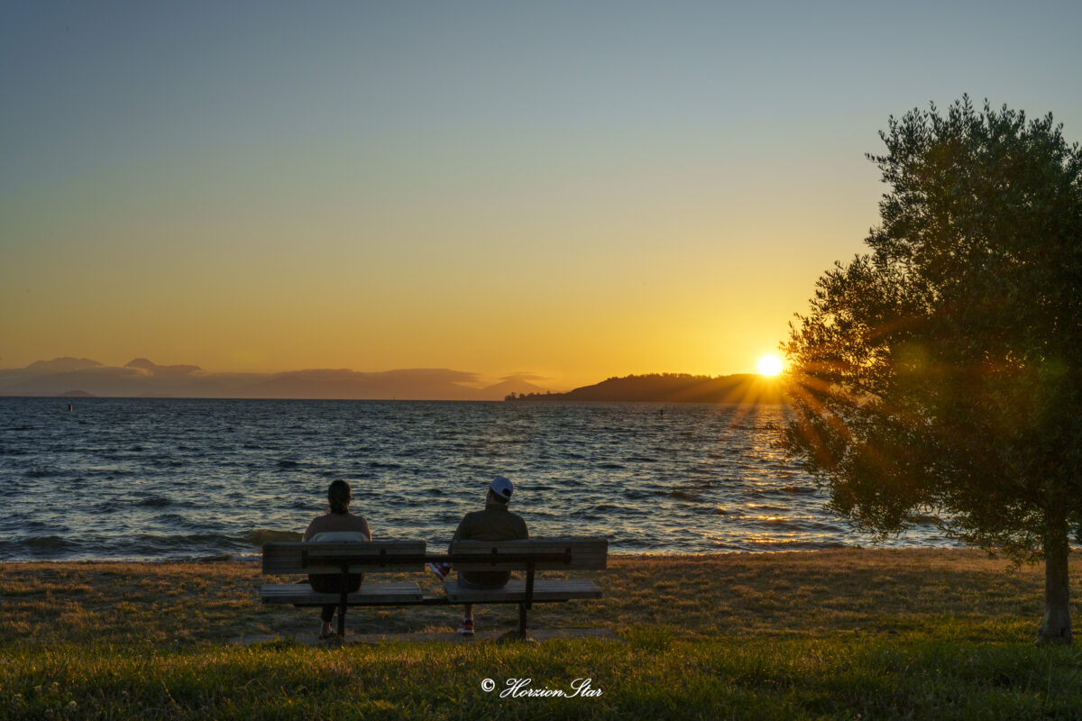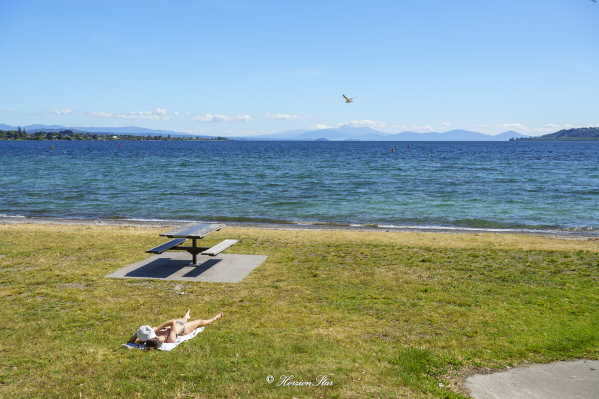 放好行李,过马路就是湖边草地。男女老幼在这里惬意的享受着阳光。