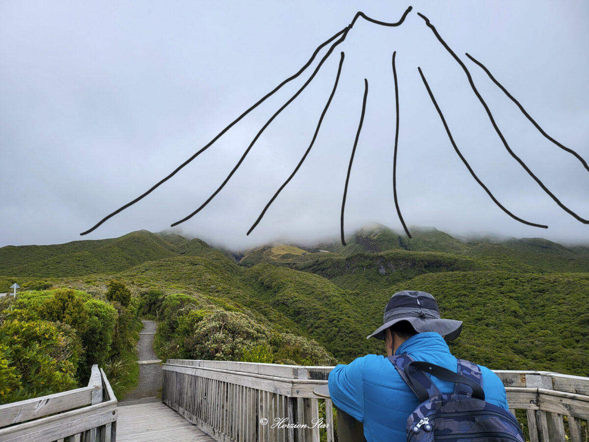 如果天气晴好,在这里会看到鲸鱼骨架包裹着Egmount的雪顶。但是我们看过去,只看到它打着的脚手架,好像在给它做心脏搭桥。