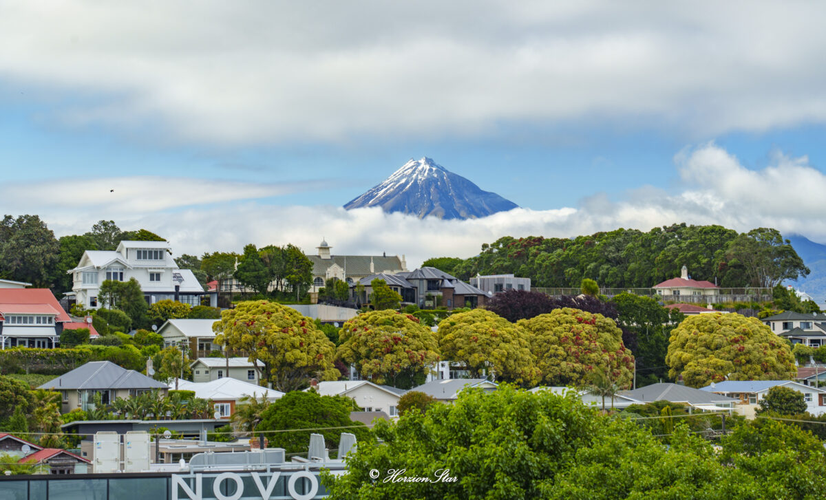 起床就跑到阳台上看看蛋山Mt. Egmount (当然它现在也改了时尚的名字,Mt. Taranaki) 。云缝之间露出了覆盖着积雪的火山口。
