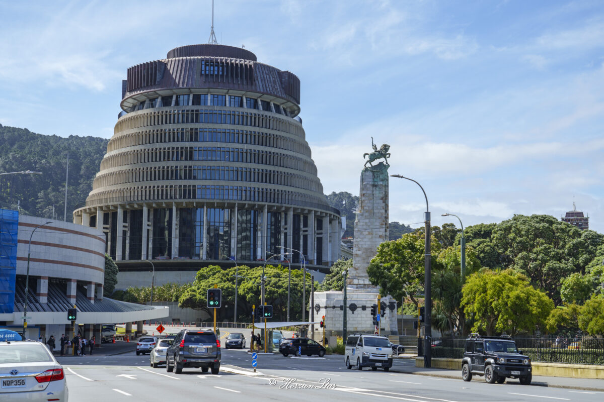 途径奥克兰的蜂巢(Beehive)政府办公大楼。