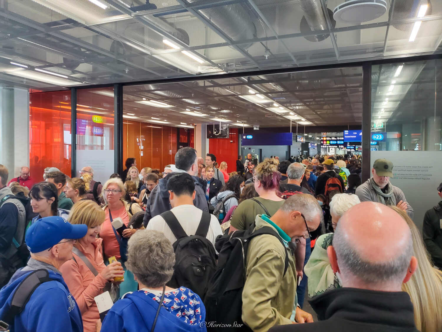总算找到了我们的候机口。然后又继续开始挤着排队。因为冰岛航空空乘以及一个胳膊上绑着胳膊箍的人(在北京就会被称作朝阳大妈的角色)要开始挨个儿检查你的护照和机票。