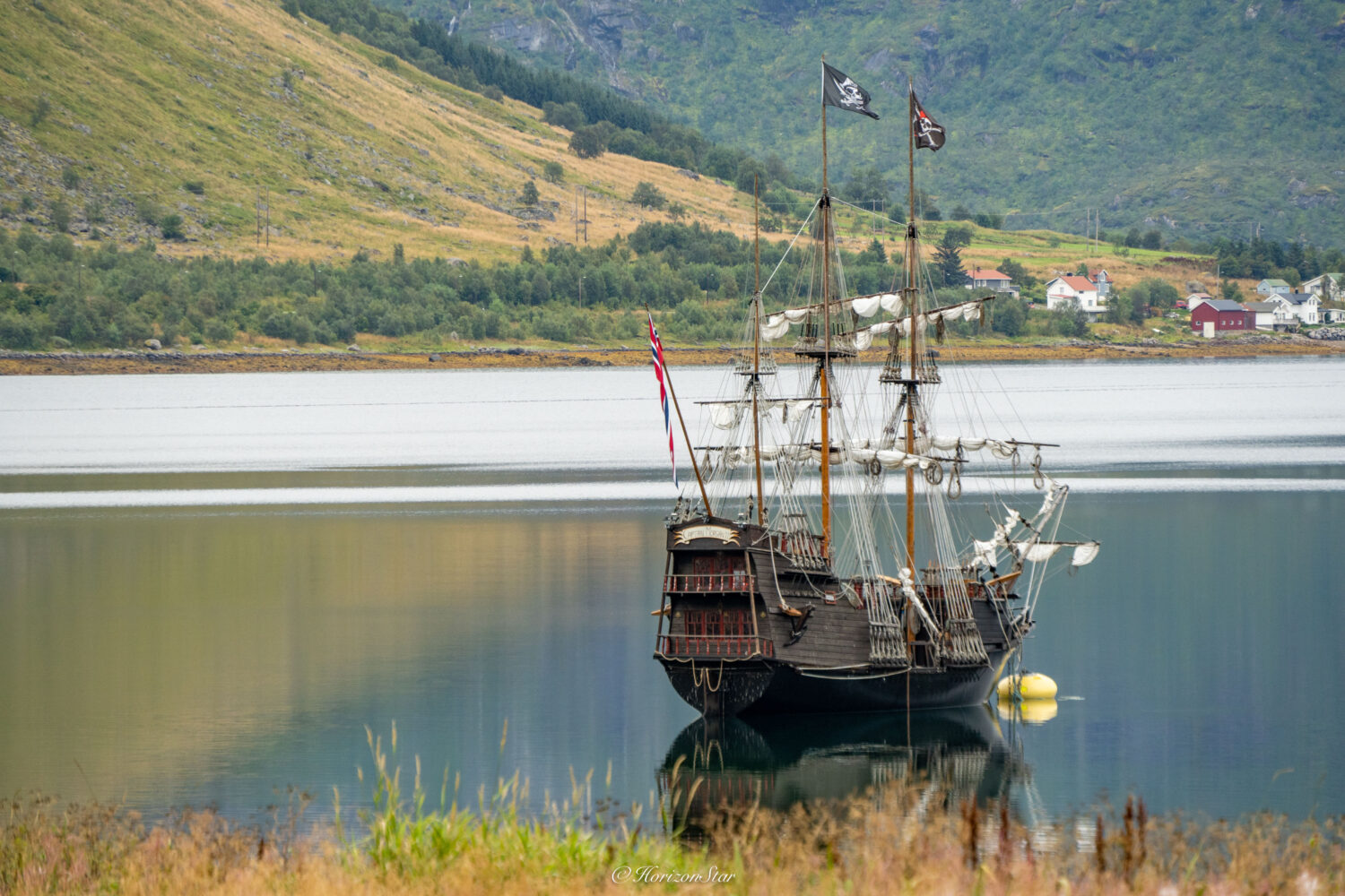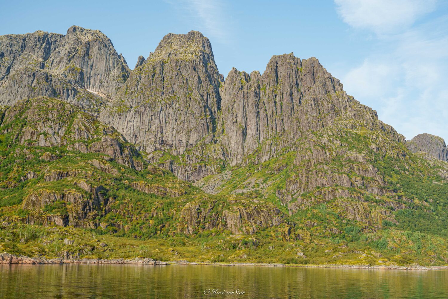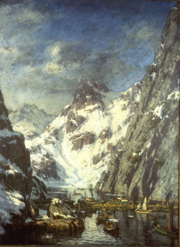 Trollfjord,山精峡湾,长2.5公里。这里在19世纪末,爆发了一场战争,先进的蒸汽动力的船主和传统渔民在这里战斗了起来。一方想要凭先进技术在这里拖网捕大西洋鳕鱼,另一方不同意。这场大战几乎所有的Lofoten渔民都参与了。最终结果就是挪威国会通过了禁止拉网捕鱼的法令。这场战争也被以Battle of Trollfjord为名的油画记录下来,据说也是纪念维京文化自此终结。