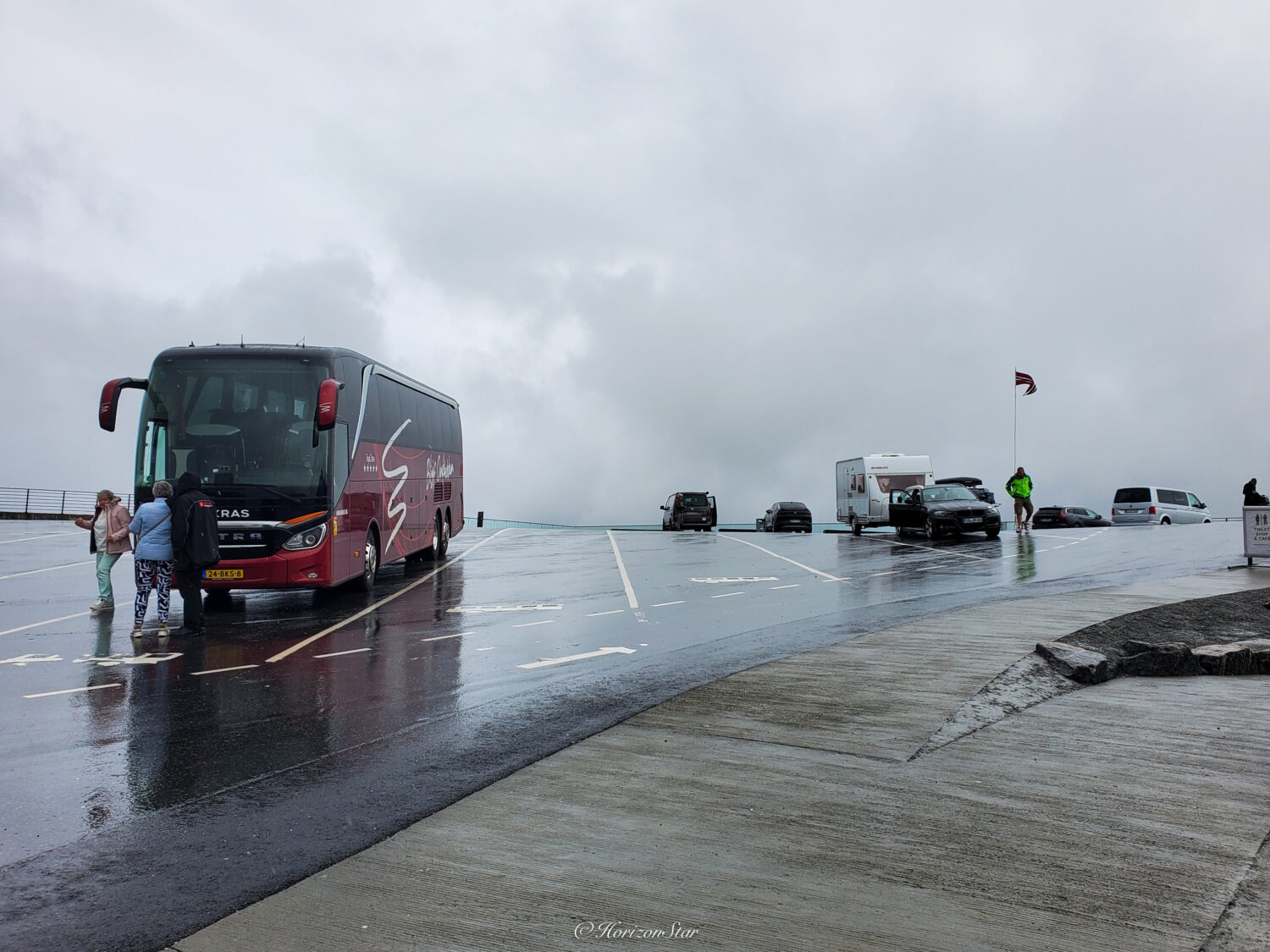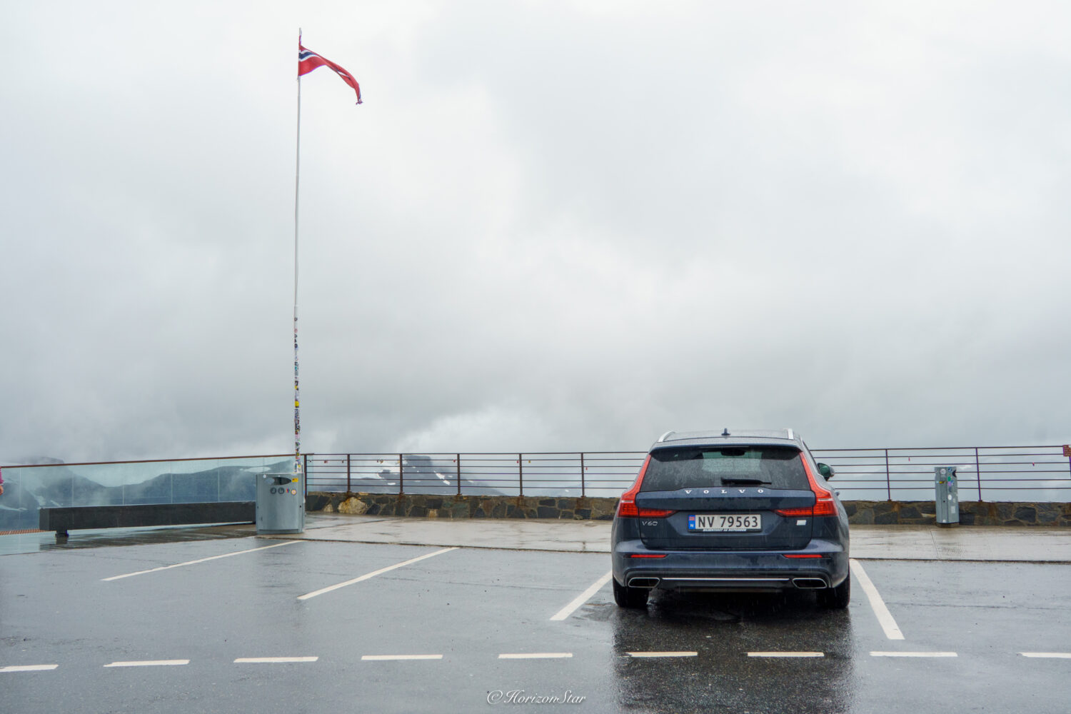 开到Geiranger观景台(Dalsnibba Utsiktspunkt) 山脚入口,上山拦着杆,300NOK一辆小车。往上看看山顶处全是云,也不知道能看到多少。犹豫了一下,老婆说:上!男人当然不能说不行,缴费上山。