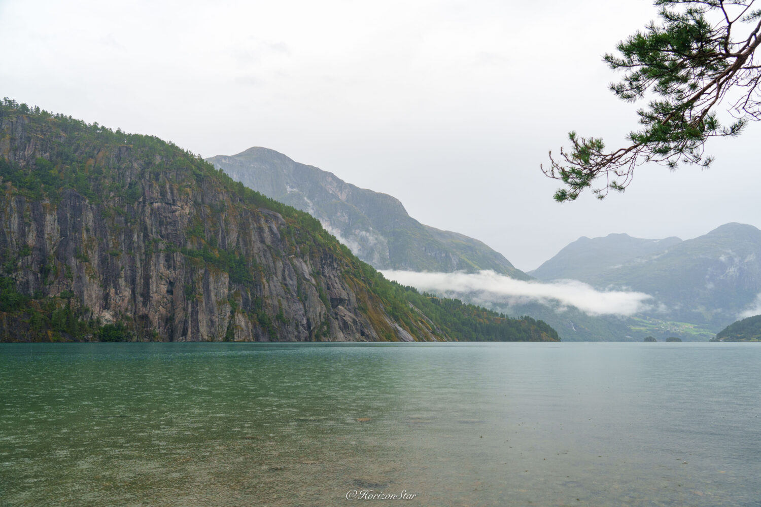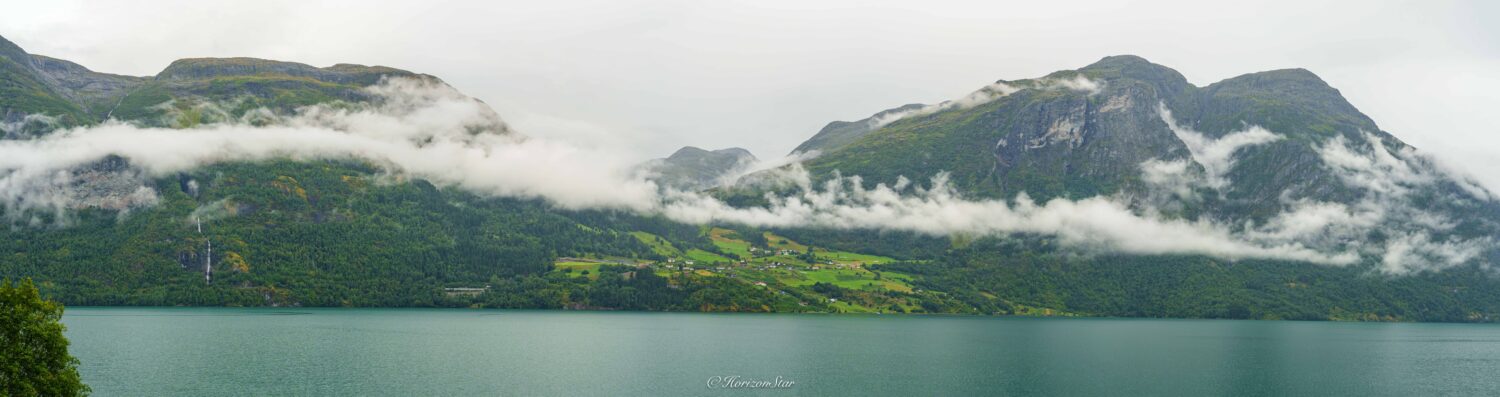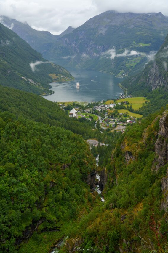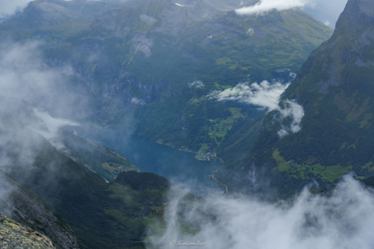 云雾在山崖下蒸腾,常常会看得到远方的Geiranger小镇。