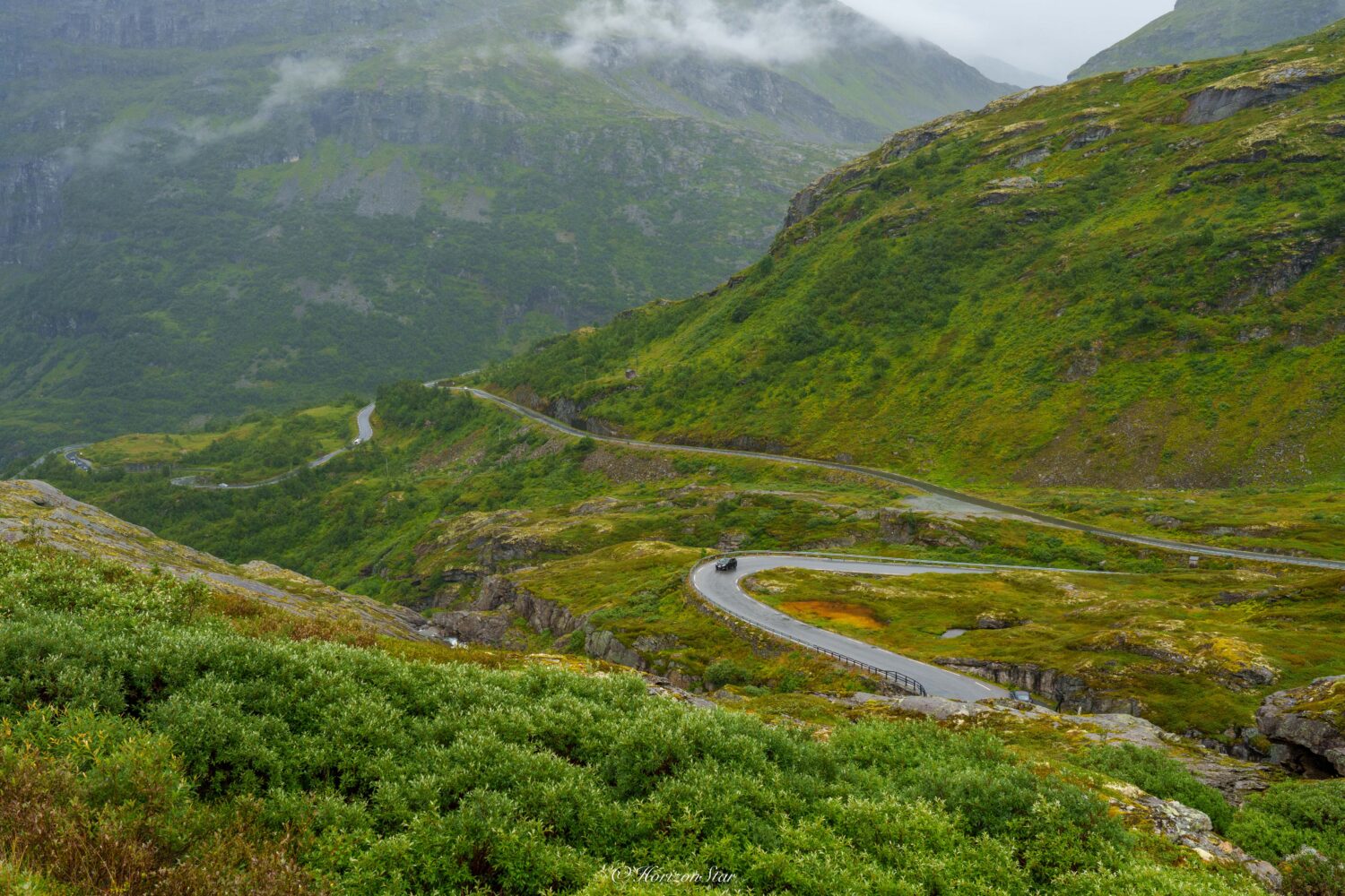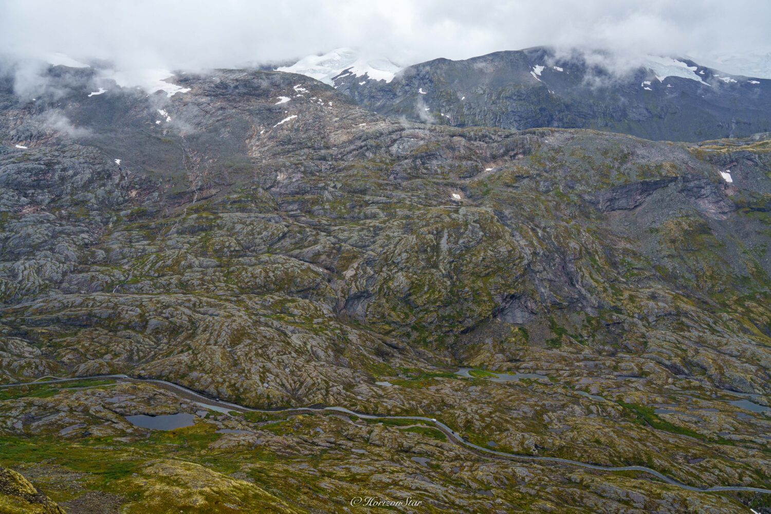 山下的苍凉大地中,公路如裸露的虬劲肌肉中的血管,细小却有力,紧紧地联系住了大山深处的盖朗厄尔峡湾。