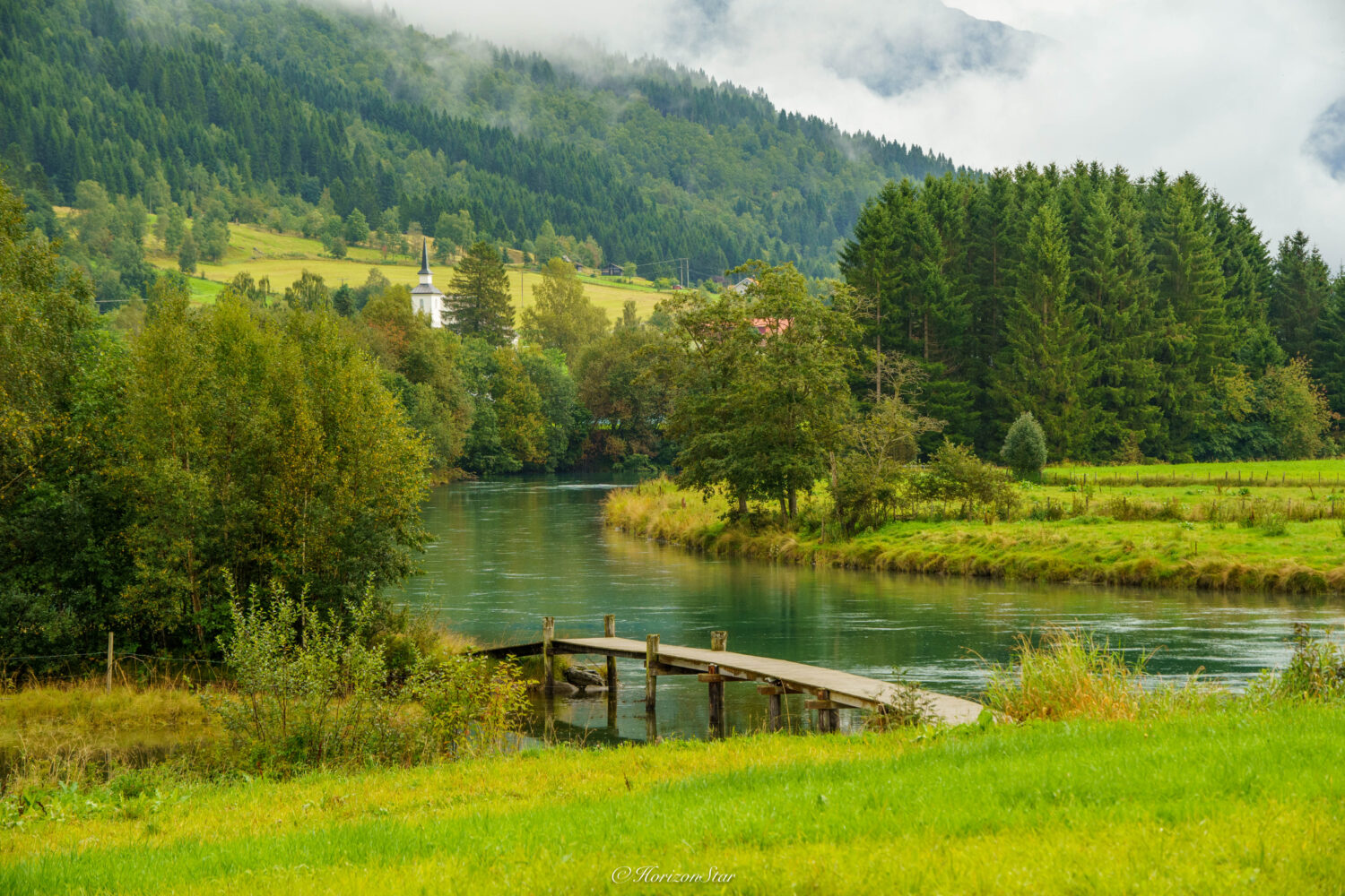 绿水缠绕,木桥斜跨,白色的教堂在林中露出身影