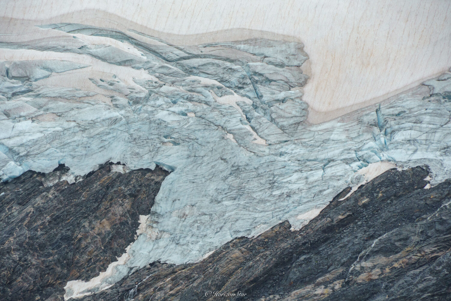 对面的冰川层层叠叠的堆积在山顶,镜头中呈现出一幅印象派的画