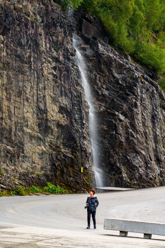 路上各种瀑布,山势险峻,连刚才觉得很高的老鹰之路都感觉只在大山的膝盖处,连腰都到不了。