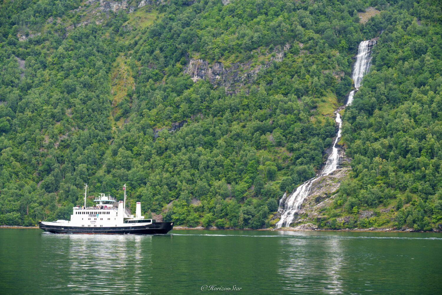 游船在峡湾航行,开向七姐妹瀑布