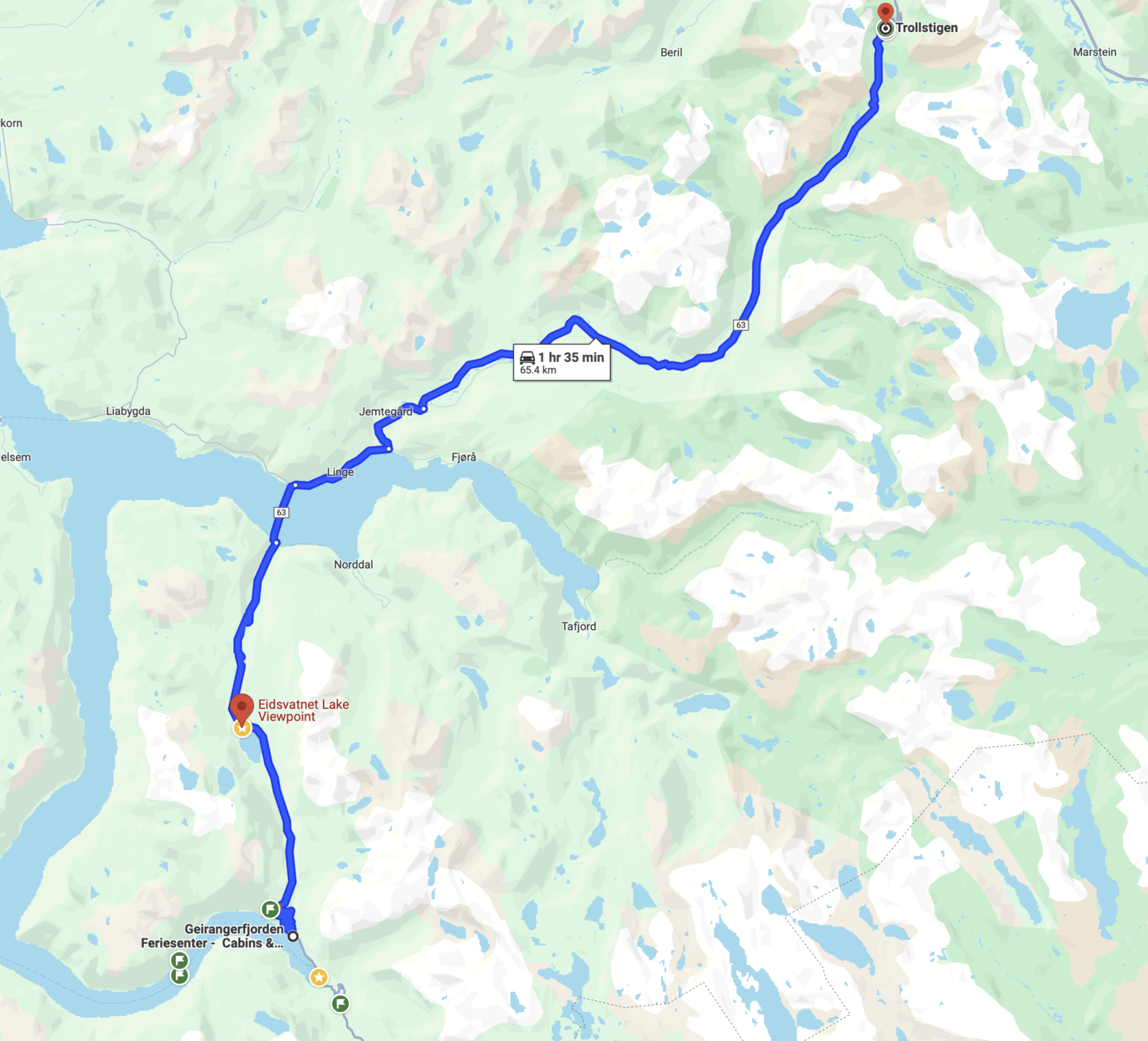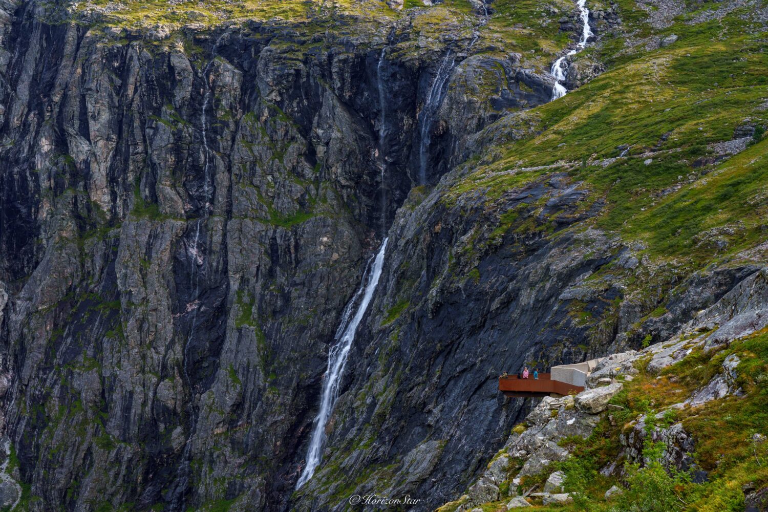 俯瞰蛇形的精灵之路在脚下蜿蜒,横跨过几条瀑布,从挪威的最高峰之间的峡谷延伸到远处。这也是我们接下来要走的路。