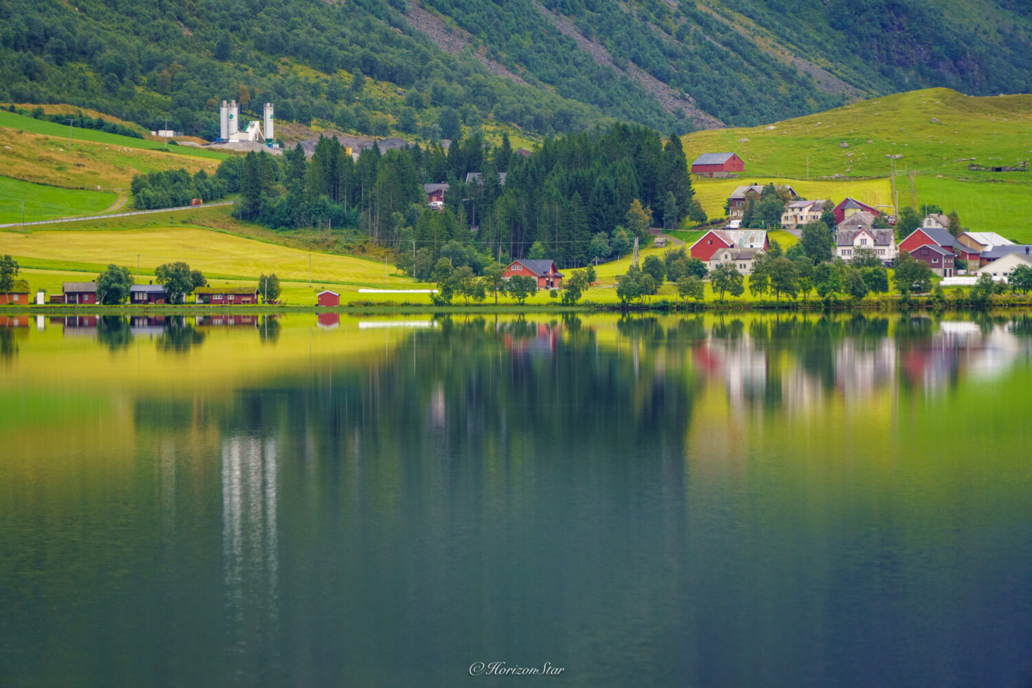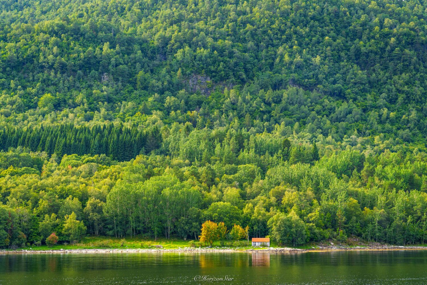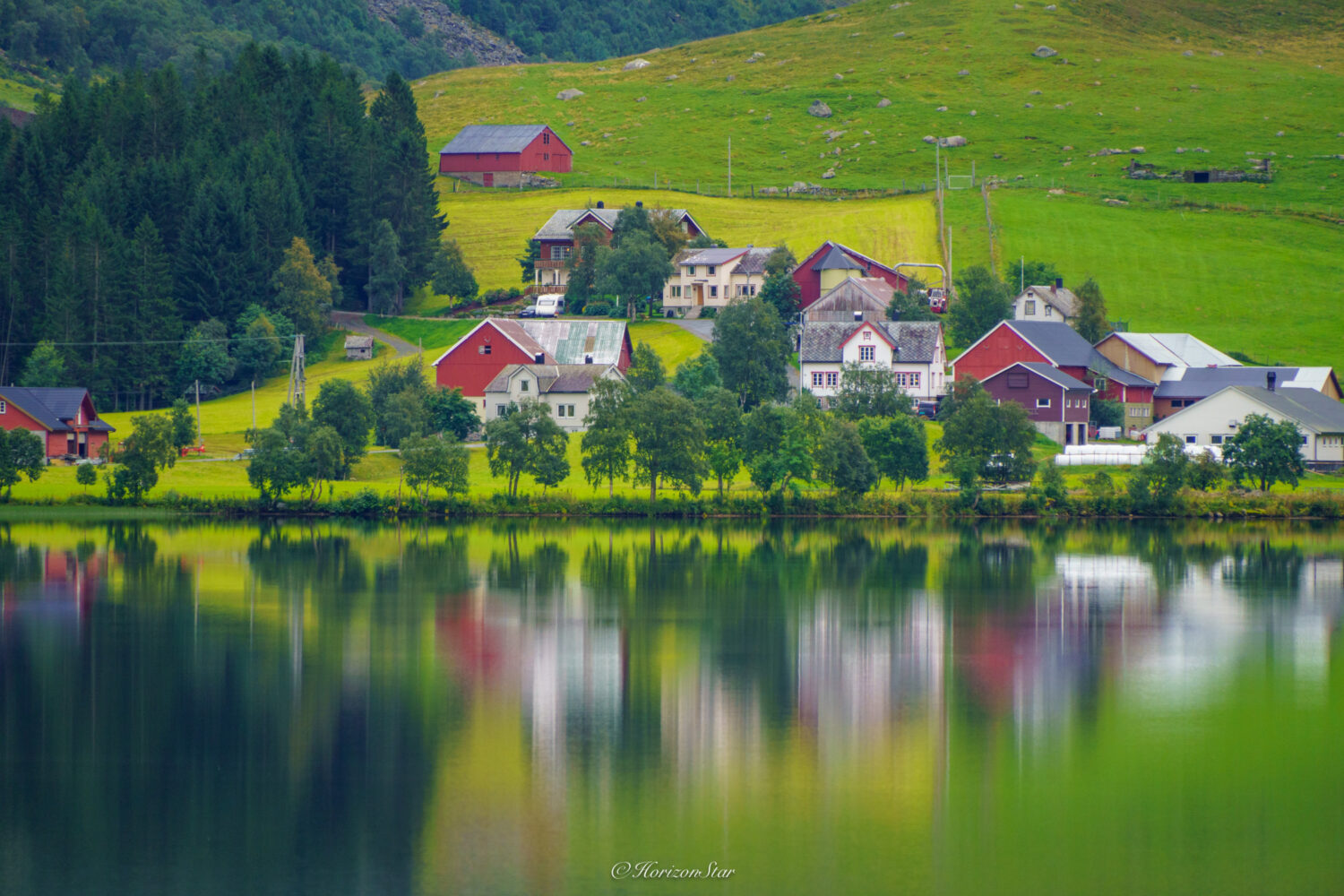 路过一个小湖Eidsvatnet,平静的湖倒影红房子。我说拍了很多了,不用停了吧?老婆一个劲的点头。于是两个人傲娇的往前开。